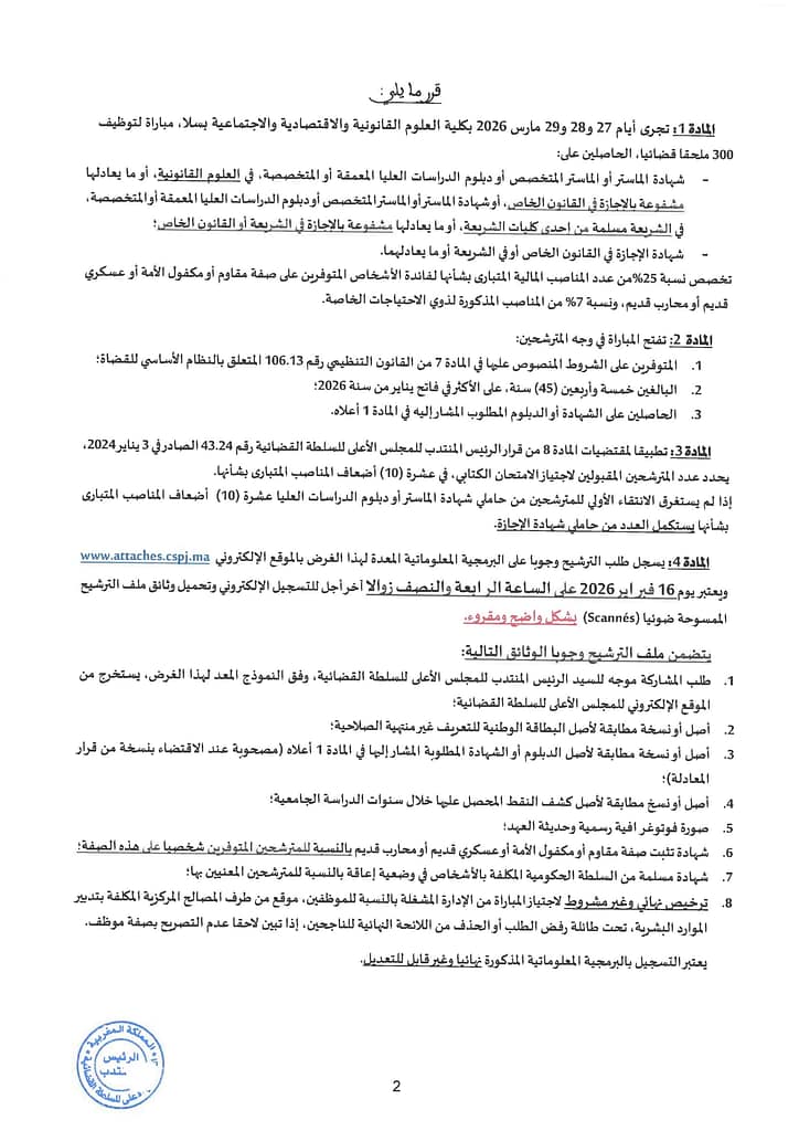 يعلن المجلس الأعلى للسلطة القضائية عن تنظيم مباراة لتوظيف 300 ملحق قضائي برسم سنة 2026.