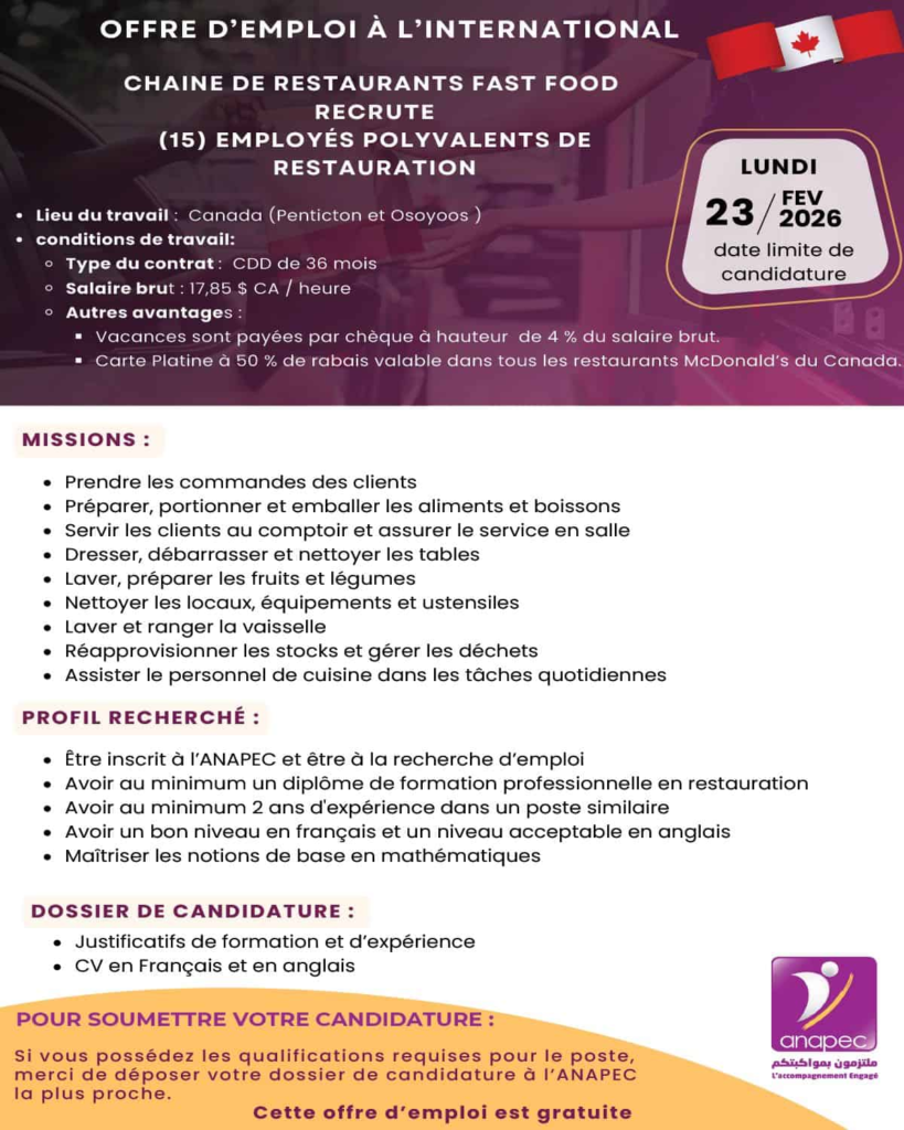 تتعلق هذه الفرصة بمؤسسات تعمل في السوق الكندي، وتوفر إطار عمل منظم، وشروط تعاقدية واضحة، ومرافقة من خلال برنامج ANAPEC. المناصب متوفرة في مدن مختلفة في كندا، مع مزايا متعلقة بالأجور والعطل والخصومات الداخلية.
