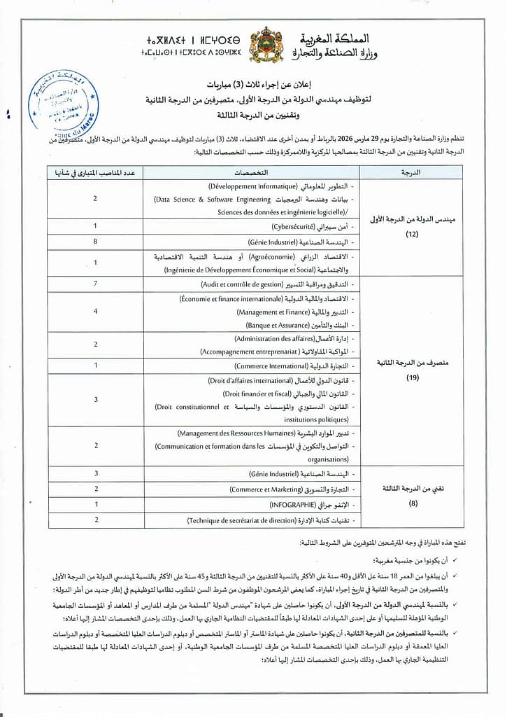 تعلن وزارة الصناعة والتجارة عن تنظيم مباراة توظيف لشغل 39 منصبا برسم سنة 2026 موزعة كالتالي: