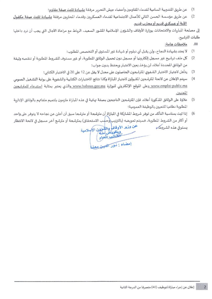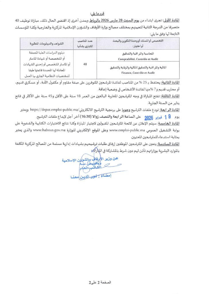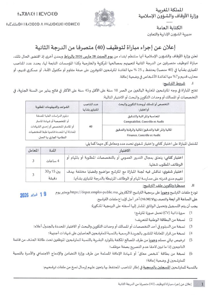 تعلن وزارة الأوقاف والشؤون الإسلامية عن تنظيم مباراة توظيف لشغل 40 منصبا لمتصرفين من الدرجة الثانية (سُلمْ 11) في مختلف التخصصات.