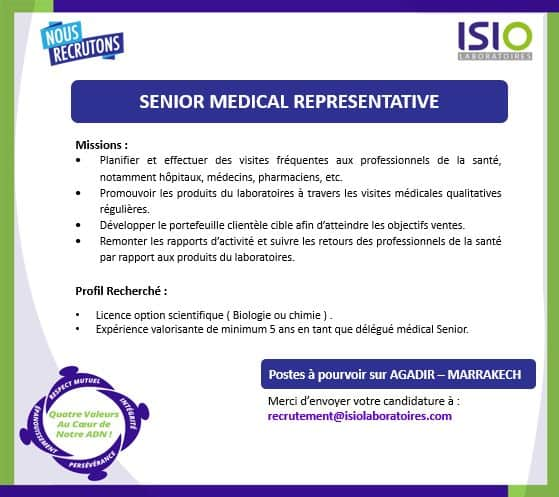 تعلن شركة ISIO Laboratoires عن حاجتها لتوظيف Senior Medical Representatives في مدينتي أكادير ومراكش بعقد دائم (CDI). الوظائف موجهة للمتخصصين في المجال العلمي ذوي الخبرة لا تقل عن 5 سنوات كمندوبين طبيين متمرسين.